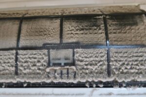 室内機のフィルターにホコリがたまっていると、風量が落ちてエアコン全体の効率が低下します。その結果、霜取りの頻度が増えたり、霜が溶けにくくなったりします。